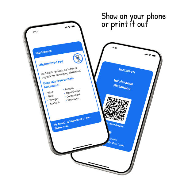 Histamine-intolerantie treedt op wanneer het lichaam histamine niet efficiënt kan afbreken, meestal door een tekort aan het enzym diamine oxidase (DAO). Dit betekent dat je voedsel dat van nature veel histamine bevat moet vermijden, zoals wijn, bier, azijn, gepekelde kaas, soja, spinazie en tomaat, evenals gefermenteerde en ingemaakte producten. Histamine komt vaak voor in sauzen, marinades, dressings en gefermenteerd voedsel, waardoor het belangrijk is om je dieetwensen duidelijk te communiceren wanneer je uit eten gaat. Of je nu door een arts of diëtist gediagnosticeerd bent met een histamine-intolerantie, deze kaart helpt ervoor te zorgen dat je maaltijden worden bereid zonder ingrediënten met een hoog histaminegehalte.