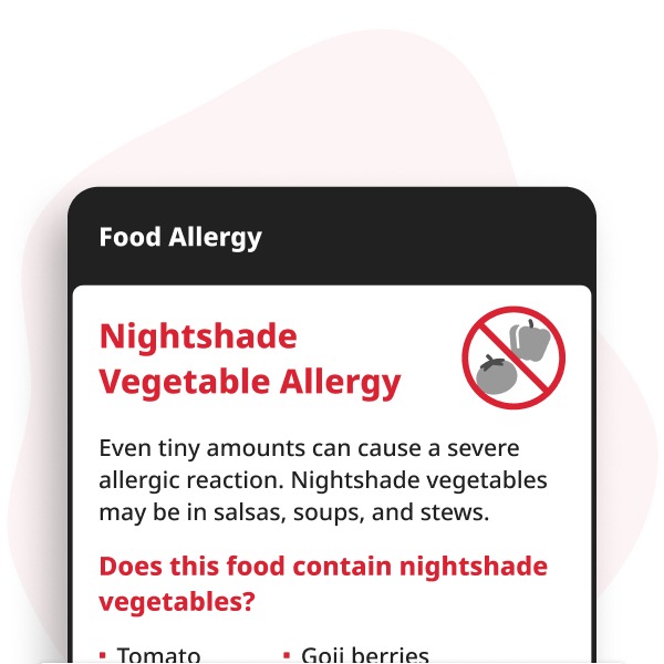Communiceer gemakkelijk je nachtschade-groentenallergie als je uit eten gaat met onze Nachtschade-groentenallergie Digitale Kaart. Deze downloadbare PDF geeft uitleg over je allergie voor nachtschade-groenten zoals tomaten, aardappelen, aubergines en paprika's, zodat het restaurantpersoneel het snel begrijpt.