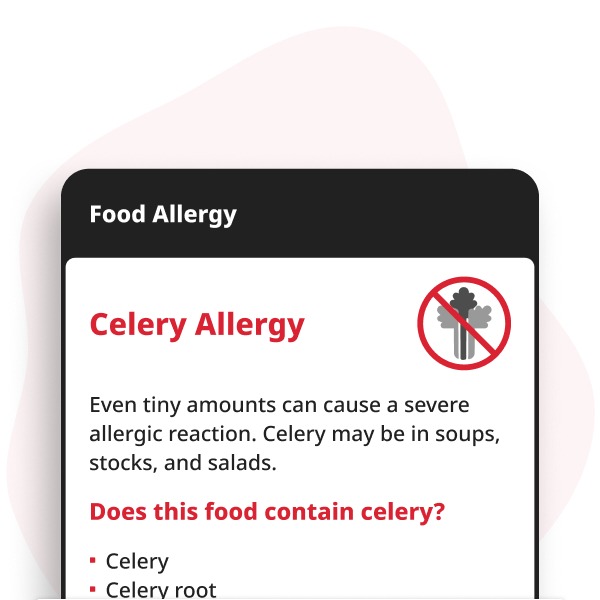 Communiceer gemakkelijk je selderij-allergie als je uit eten gaat met onze Selderij-allergie Digitale Kaart. Deze downloadbare PDF legt je allergie duidelijk uit, zodat het restaurantpersoneel het snel begrijpt.