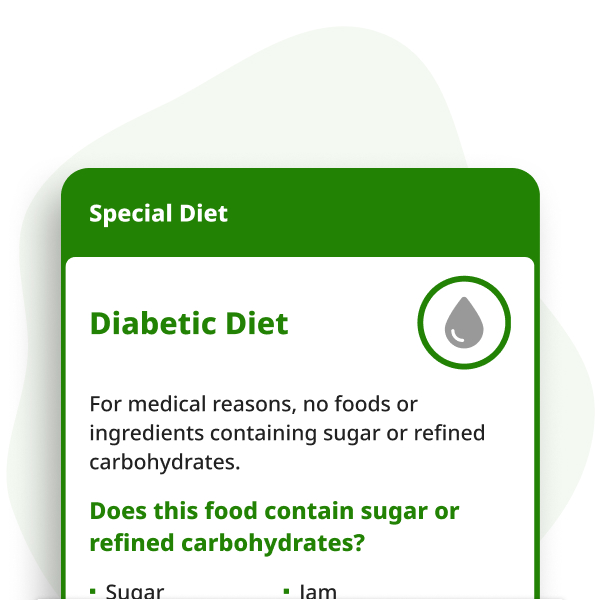 A diabetic diet is a medically necessary diet that excludes foods containing sugar and refined carbohydrates in order to help manage blood sugar levels. This means avoiding common items such as sugar, honey, white bread, white rice, pastries, sodas, jams, and dried fruit. These ingredients are widely used in sauces, dressings, desserts, beverages, and prepared meals, making it important to communicate your dietary needs clearly when eating out. Because consuming these foods can have serious health consequences, it is essential that restaurant and hotel staff understand your requirements. This card helps ensure your meals are prepared without sugar or refined carbohydrate-based ingredients.